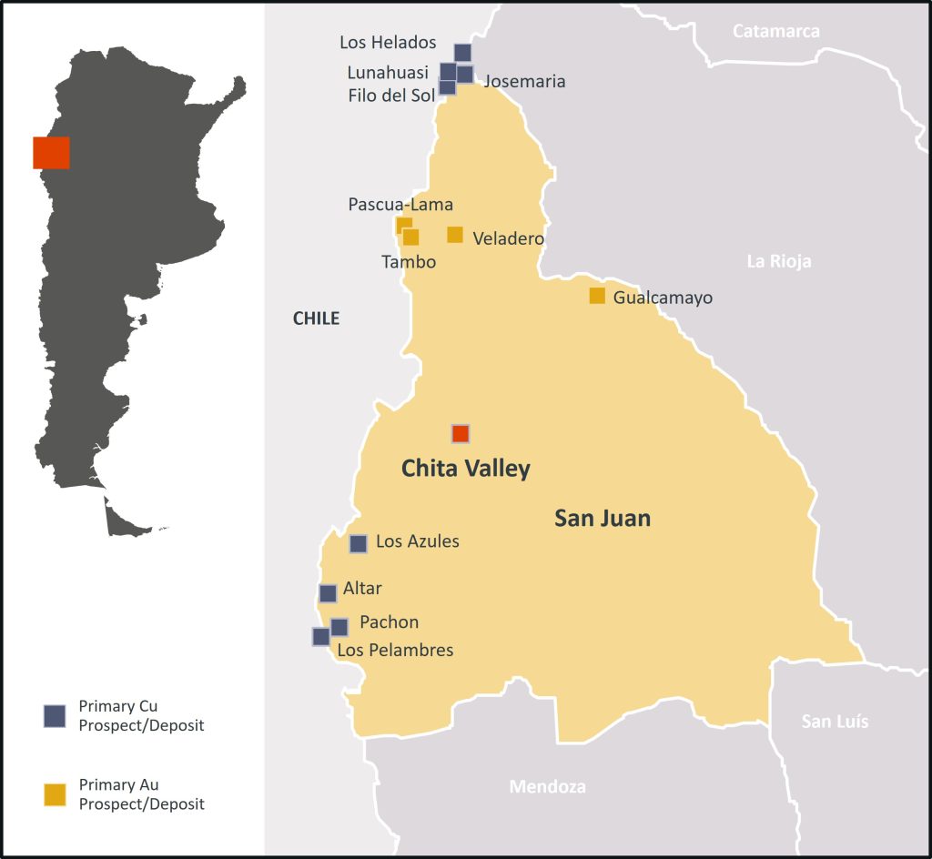 El Proyecto Chita, está situado en la provincia minera de San Juan, Argentina, dentro de un prospectivo cinturón, con varios yacimientos de cobre y oro. Dentro de la propiedad tenemos el depósito de Chita, definido históricamente por su recurso en cobre, y más recientemente se ha identificado un nuevo descubrimiento relacionado con el depósito polimetálico de Chinchillones.