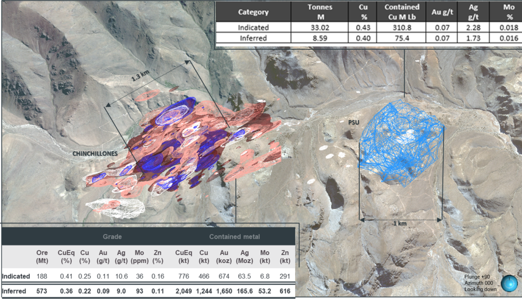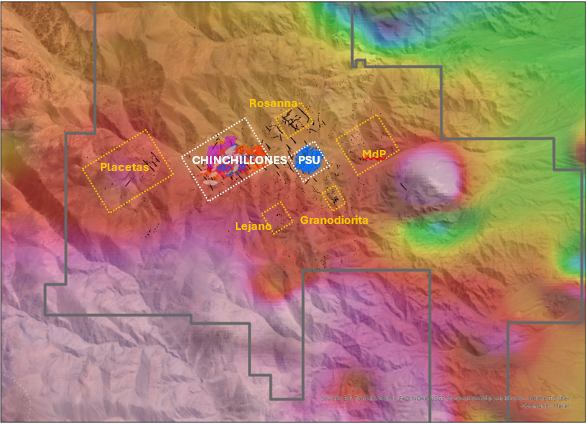 Actualmente los dos depósitos importantes dentro de la propiedad, PSU (enriquecimiento de Cu de Chita), y el recientemente descubierto Complejo Chinchillones (polimetálico de Cu, Mo, Au, Ag, Pb y Zn), asociados a sistemas porfido del Mioceno a la altura del Au-Cu Indio Belt (Chile). Adicionalmente presenta otras areas prospectivas como Minas de Pinto, Complejo Placetas, Rosanna, Lejano y Granodiorita.