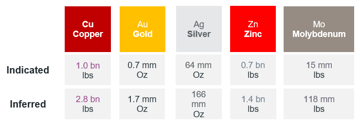 - 761 Mt con 1.71 Mt Cu, 2.32 MOz Au, 229 MOz Ag, 907 kt Zn, y 60 kt Mo.
